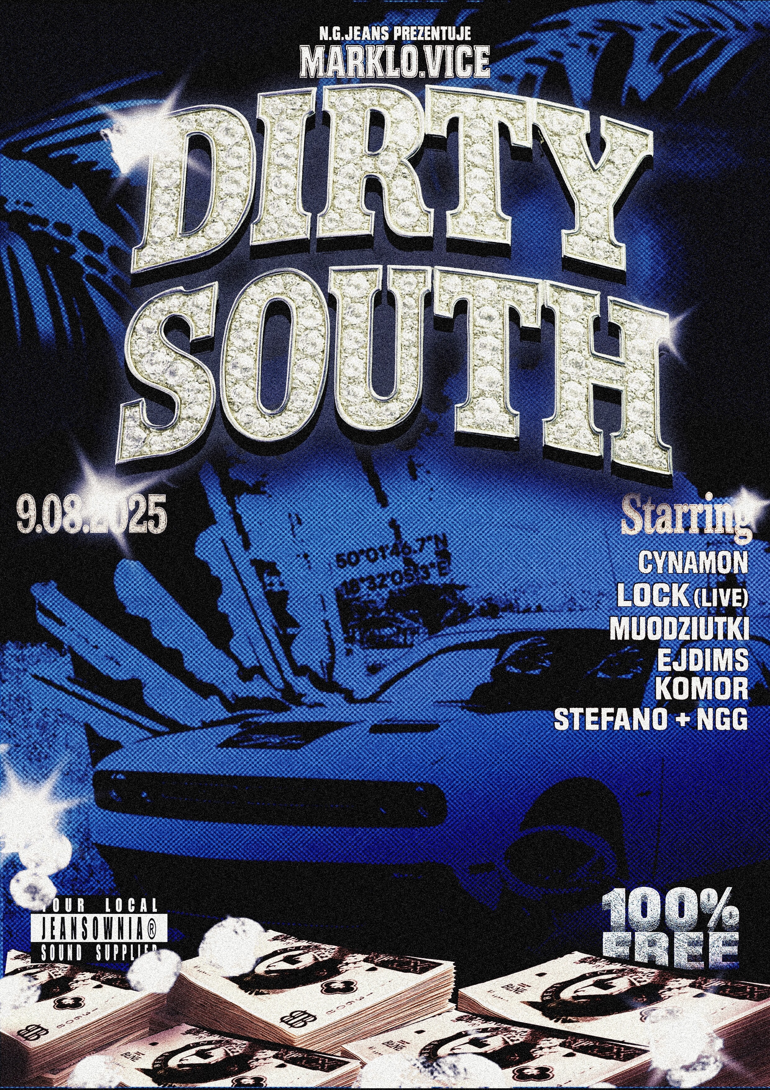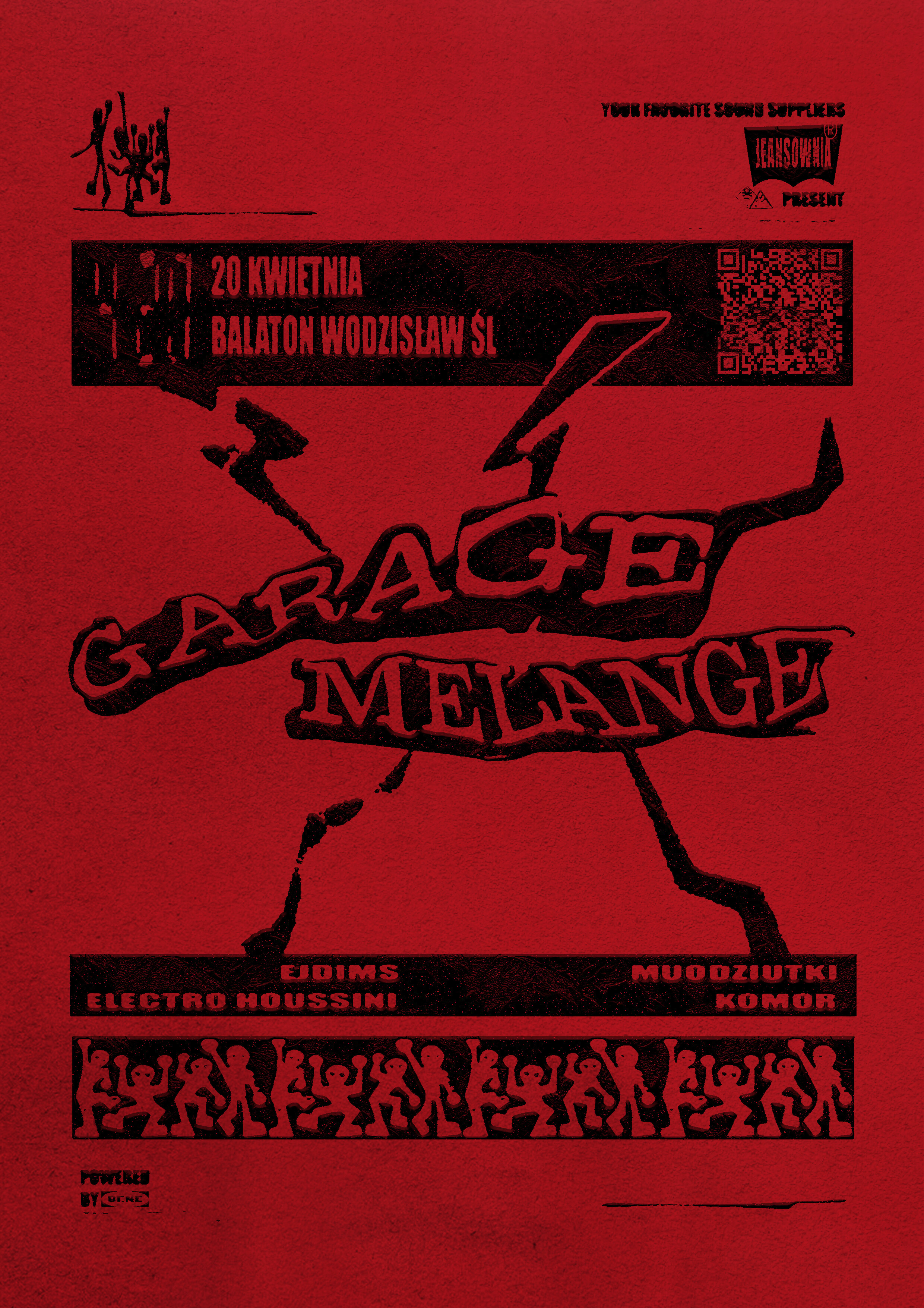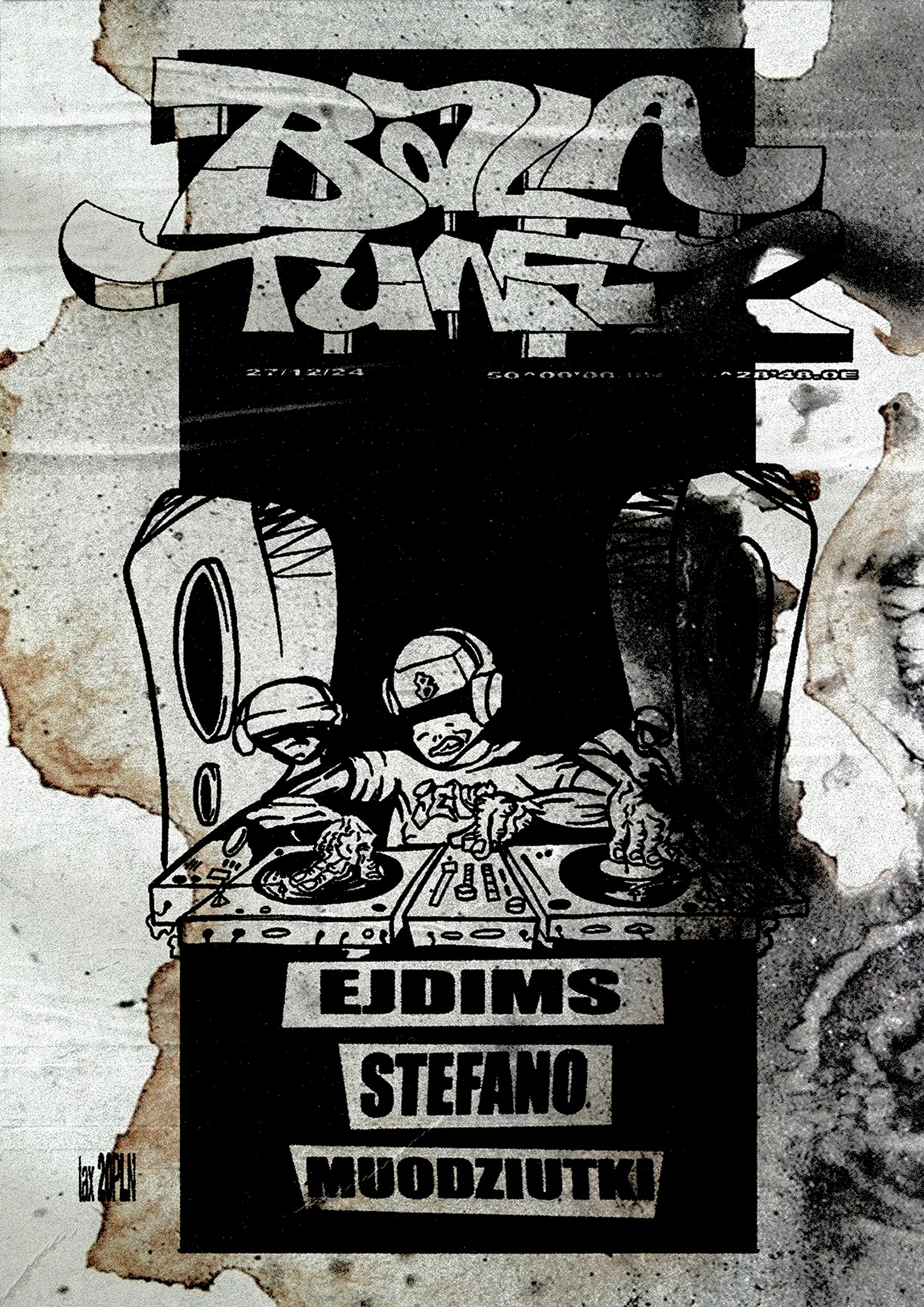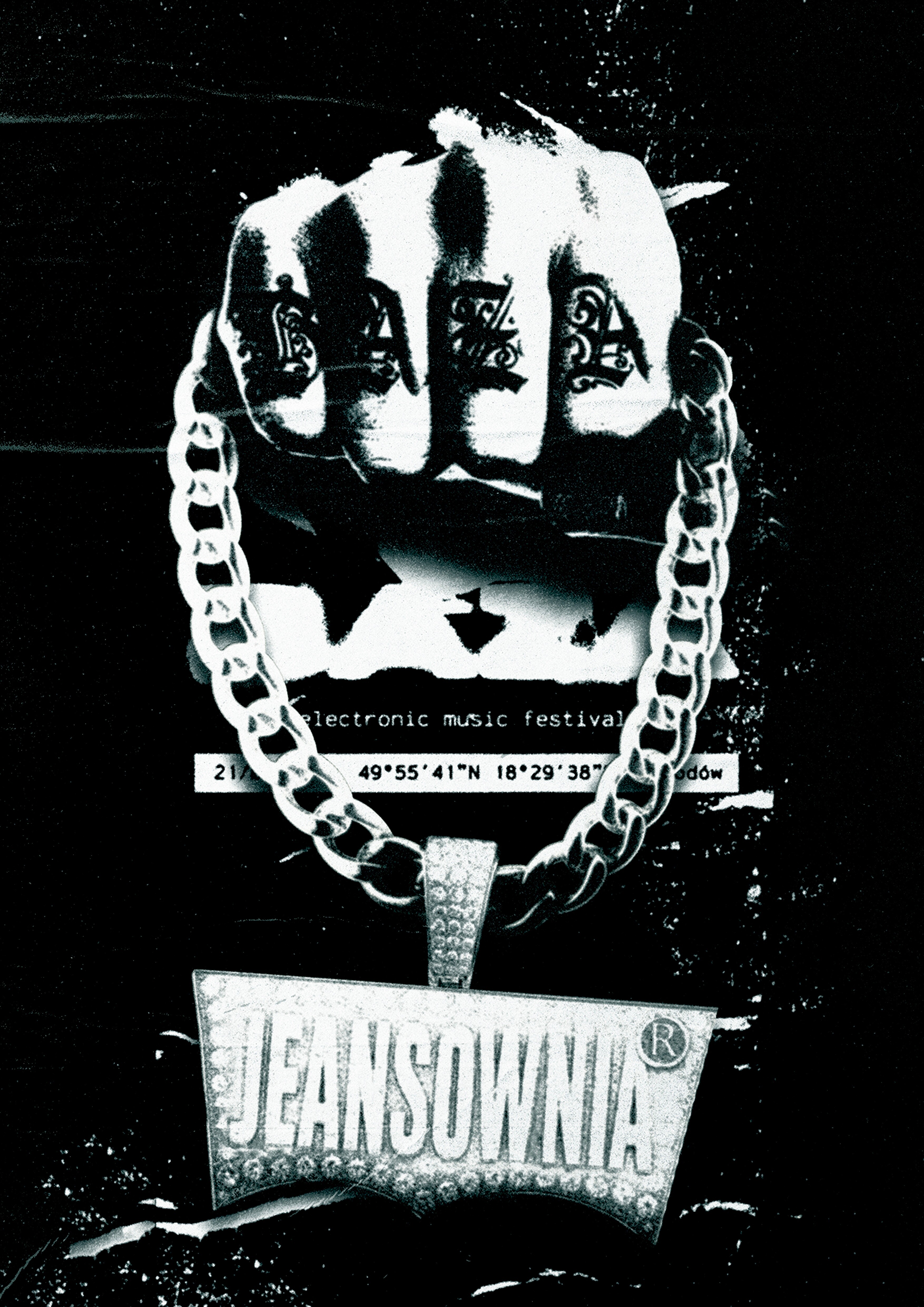 Since 2024, I’ve been collaborating with the DJ collective **Jeansownia** as a graphic designer and creator of their visual identity. I designed the collective’s logo and developed a cohesive graphic style for four music events we organized together. Each event was promoted with a custom poster that we hip-hop-style wheatpasted around the city at night. The posters share a raw, expressive aesthetic with strong contrast and bold typography. Color plays a key role — each design either features an intense background or a deliberate lack of color, depending on the nature of the event. The creative process always began with hand-drawn ink sketches, later scanned and digitally processed. Visually, the work draws inspiration from comics, bootlegs, xerox art, and 1990s rave flyers — a style often balancing between pastiche and authenticity.